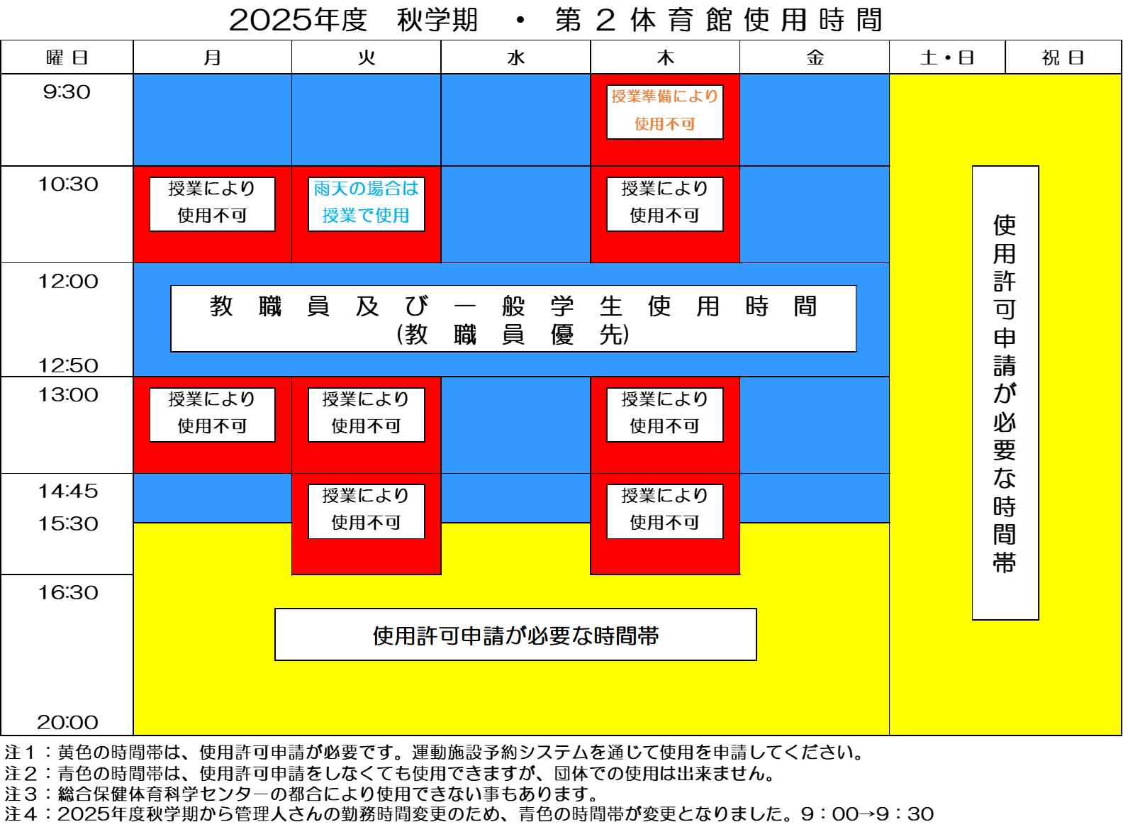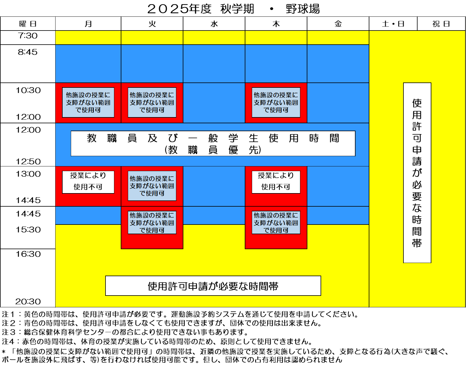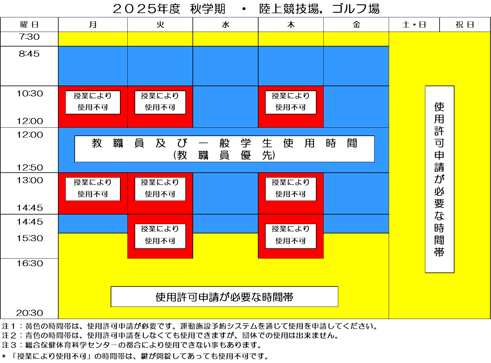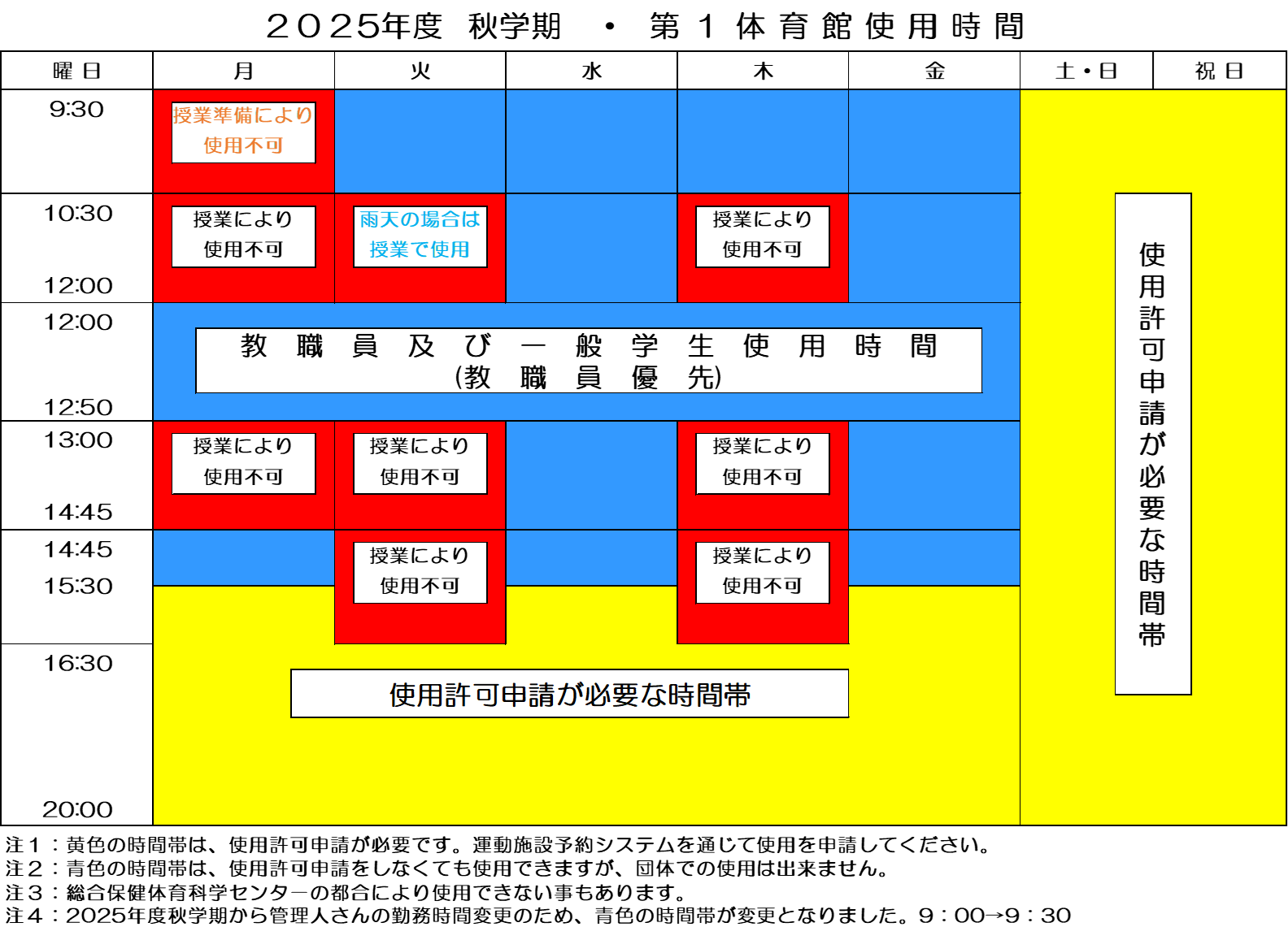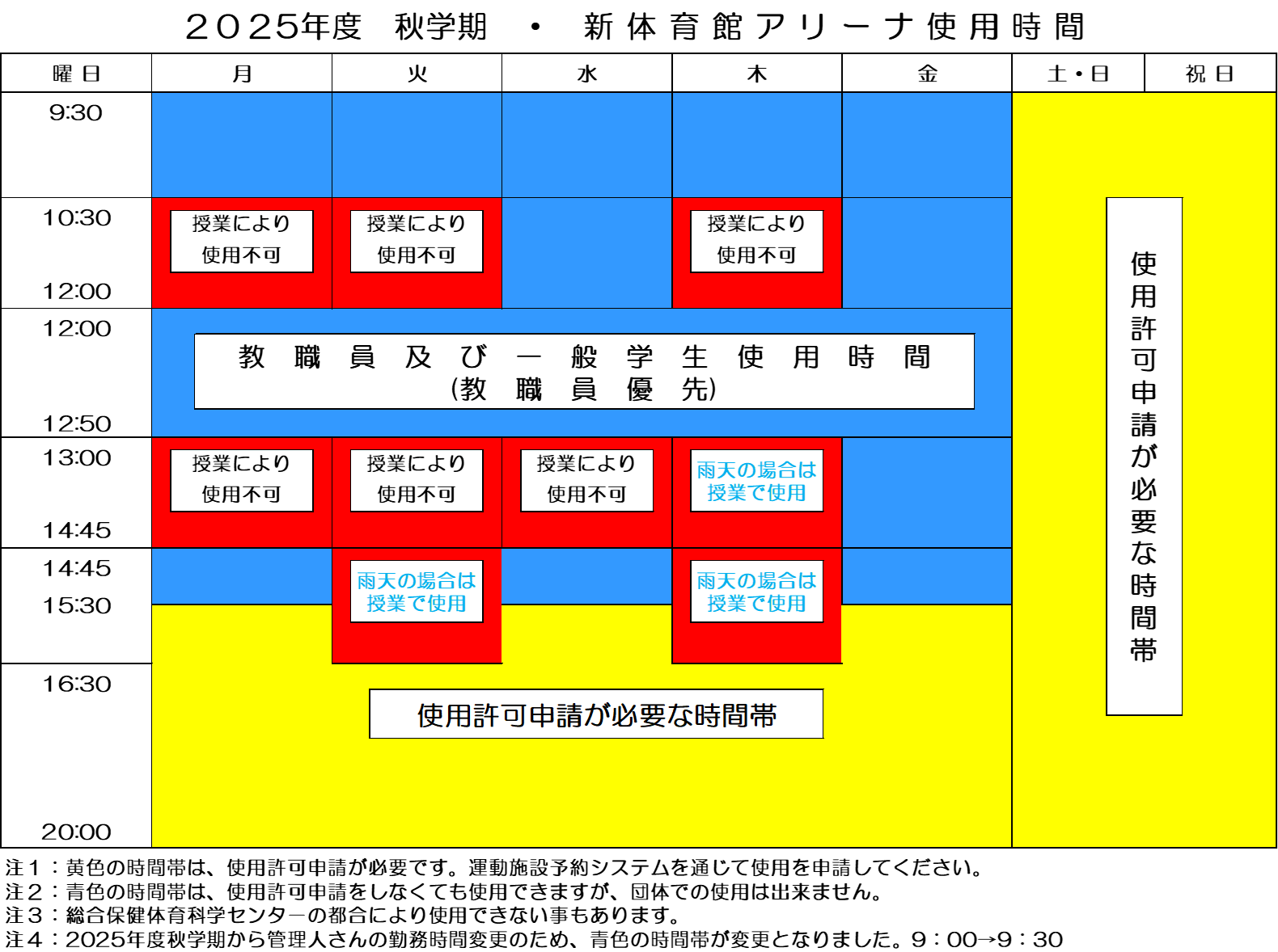 各運動施設によって利用できる時間帯が異なりますので,下記をご確認ください. なお,下記の表のうち,青色で示した時間帯は,使用許可の申請がなくても使用できます.ただし,総合保健体育科学センターの都合により,使用できない場合もあります.また,黄色で示した時間帯は,使用許可の申請が必要な時間帯です.団体で占有利用する場合は,運動施設予約システムを通じて申請してください.
