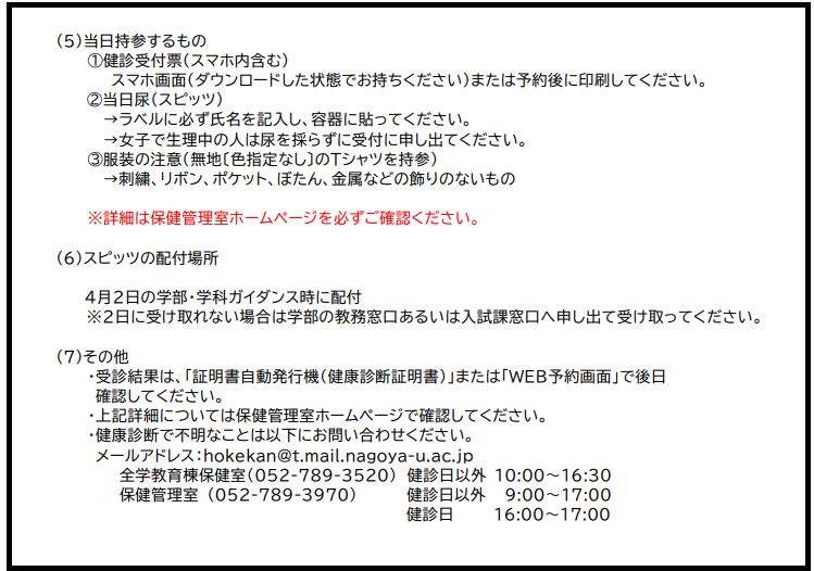 LGBTなどの方で、男女別あるいは集団での健康診断に不安な方は、遠慮なく、保健管理室の窓口、電話(052-789-3970:16時~17時)、メール(hokekan@t.mail.nagoya-u.ac.jp)でご相談ください。