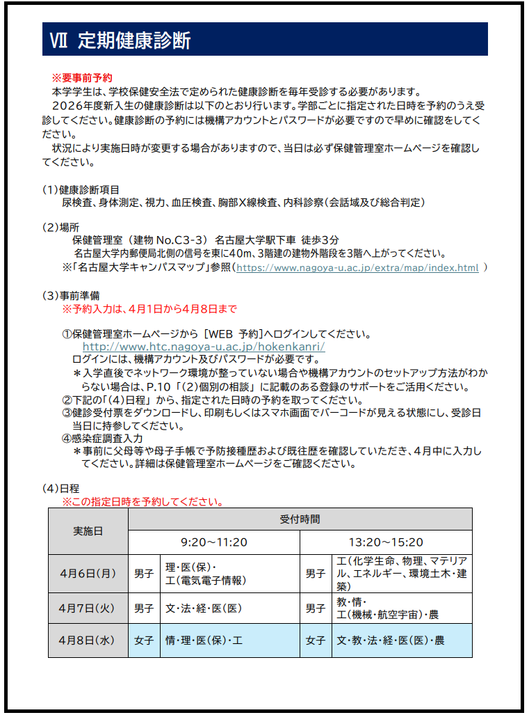 2026年度 学生定期健康診断 学部新1年生