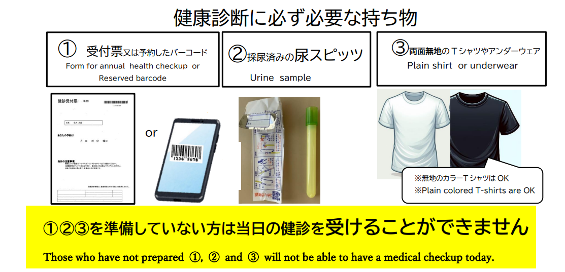 健診当日、貴重品は自己管理になります。責任を負いません。持参する荷物は少なくしてください。 軽装でお願いします(ワンピース・ブーツ・アクセサリーなどは避けてください)。また、髪が肩から下におりないようヘアゴムなどでアップスタイルにできるようにしてください。