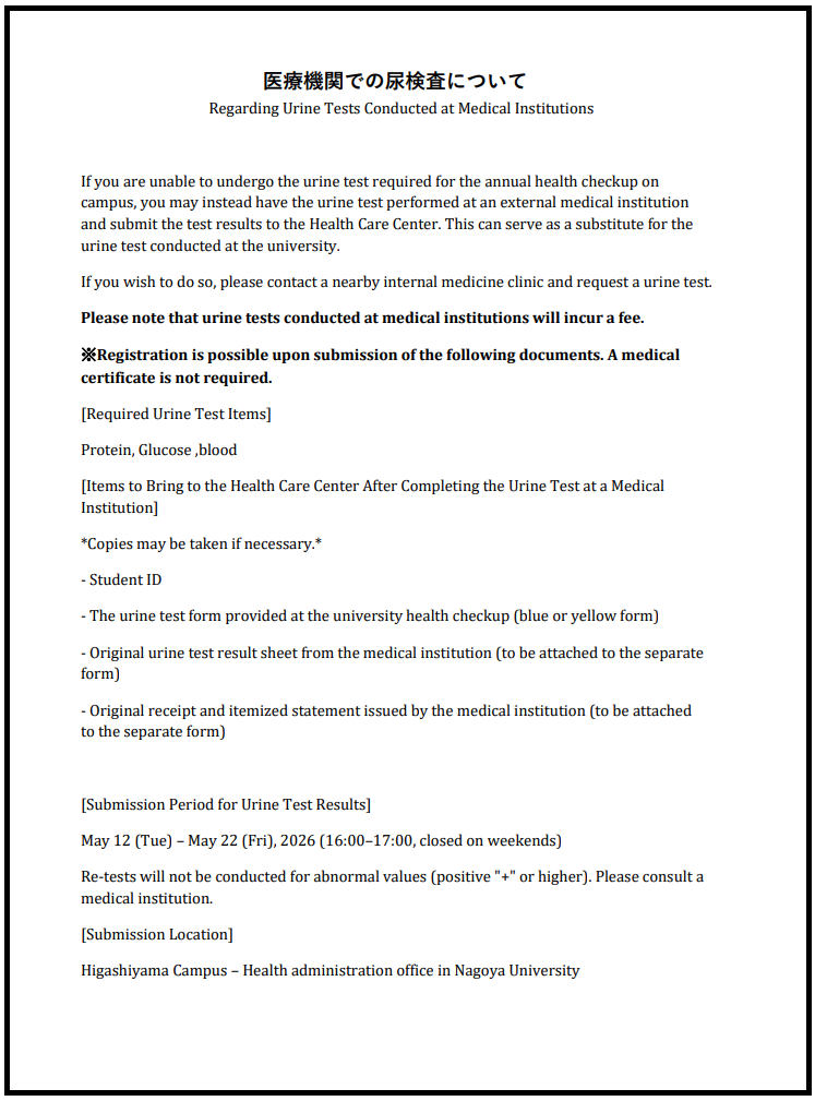 However, in that case, the university is unable to issue a health checkup certificate or a medical certificate. (By turning in a copy of the health checkup, we will consider it as having taken this year’s periodical health checkup.)