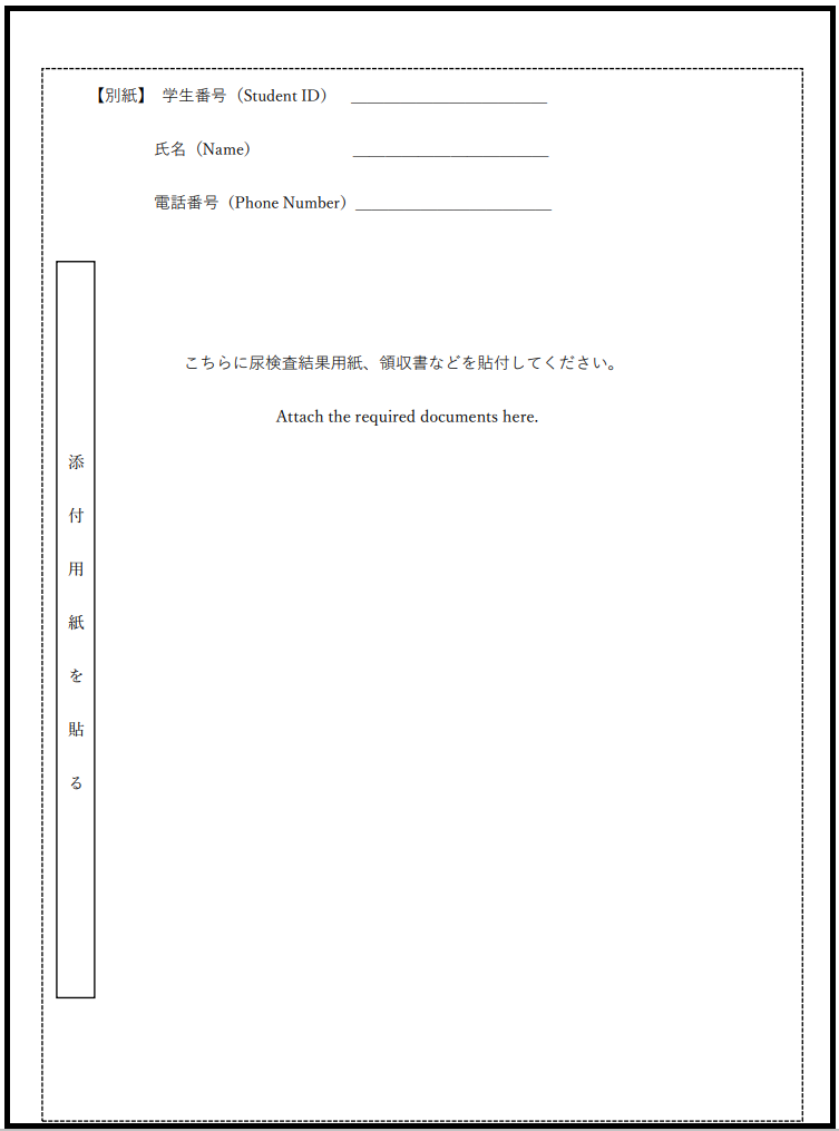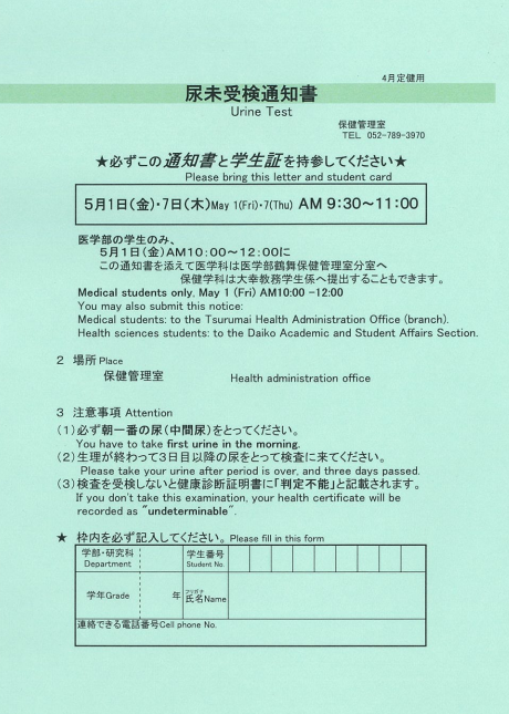 女子は生理期間中を避けた日程で受診してください。当日こちらの用紙をお渡しします:尿未受検日(女子用)