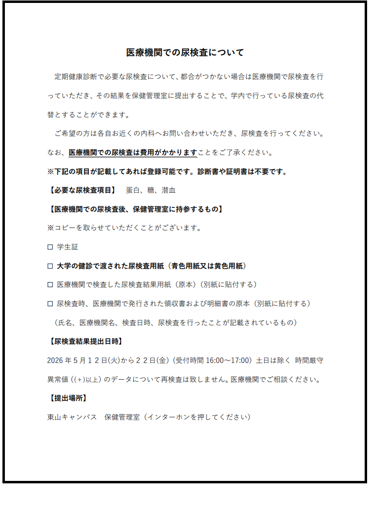 保健管理室のホームページで必ず最新情報をご確認の上、健診にお越しください。特に診断書の必要な方や、就職活動(エントリー申請含む)で必要になる方も、早めの日程で受診ください。