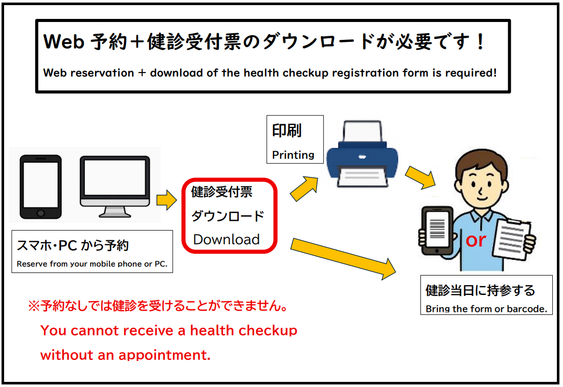 ※健康診断を行っている時間帯は予約システムを停止する可能性があります。その場合はログインできませんので事前にダウンロードまで行ってください。また、予約が行えない場合は健診時間外に行ってください。