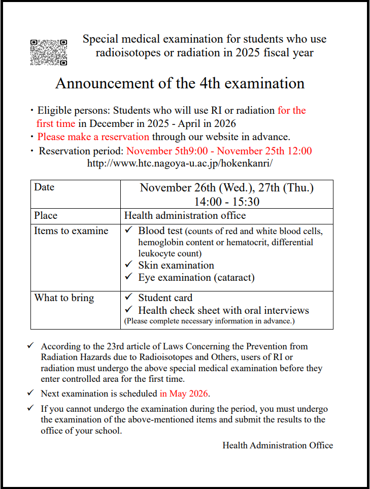 名古屋大学において放射線を取り扱う実験実習等に従事する学生は特殊健康診断を受けなければなりません。対象者は本年度放射線を取り扱う学生全員です。