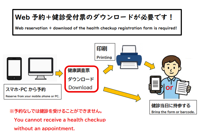 ①健診受付票(印刷した用紙またはスマホ等の画面表示)※予約後必ずダウンロードしてください!